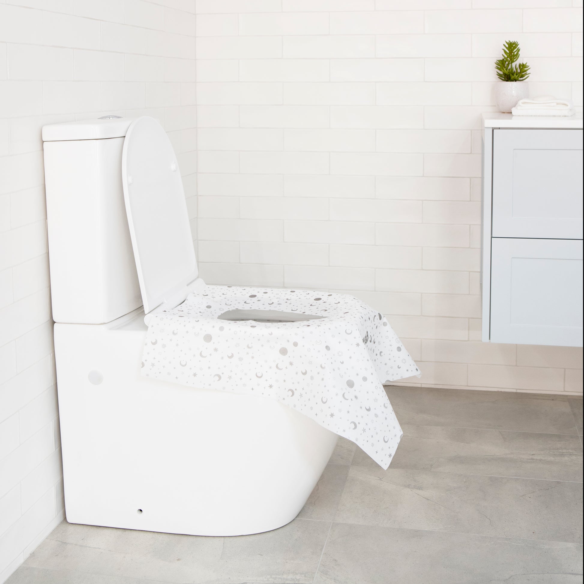 We love the planets and we love stars and moons. This toilet seat cover has cute prints of stars & moons in black & white.